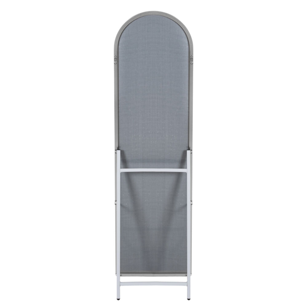 Ο FB99578.40 είναι ένας καθρέφτης δαπέδου με ΑΣΗΜΙ σκελετό, κομψός και σε άκρως ικανοποιητική διάσταση. Ένα χρήσιμο «εργαλείο» για κάθε υπνοδωμάτιο που θα ταιριάξει με την διακόσμηση σας, είτε είναι κλασική είτε πιο μοντέρνα. Η στήριξη γίνεται με μια πτυσσόμενη αλουμινένια διάταξη. Ο καθρέφτης στο επάνω μέρος του έχει αψιδωτό σχεδιασμό.