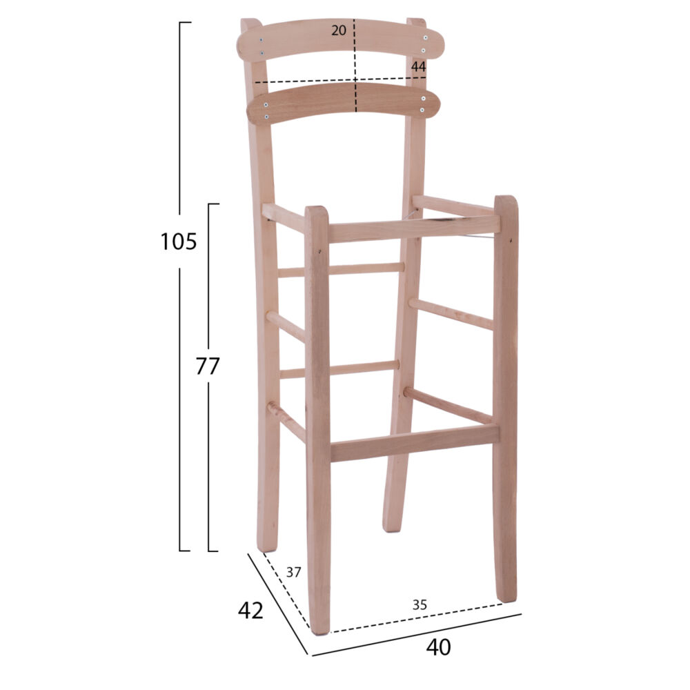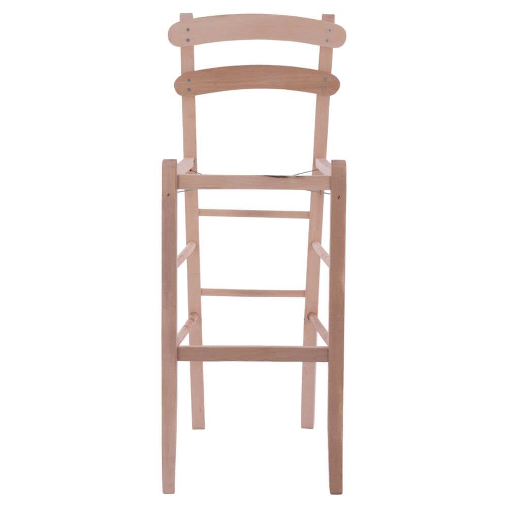 Αυτό το ξύλινο σκαμπό είναι κατασκευασμένο με παραδοσιακό σχεδιασμό με 4 ψηλά πόδια, που ενώνονται με βέργες που χρησιμεύουν και ως υποπόδια, τετράγωνο κάθισμα και ικανοποιητική πλάτη, χωρίς μπράτσα. Παραδίδεται άβαφο και μπορεί να χρησιμοποιηθεί σε διάφορους επαγγελματικούς χώρους, αρκεί να υπάρξει αντίστοιχη διακοσμητική «ματιά».