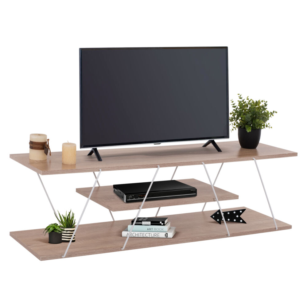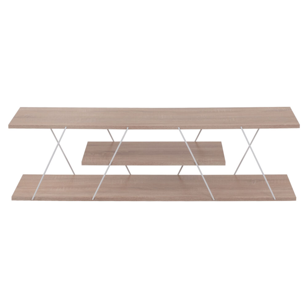 Το FB98922.14 είναι ένα όμορφο έπιπλο σε SONOMA χρώμα με μοντέρνο design που θα αλλάξει την εικόνα του σαλονιού ή του καθιστικού σας προς το καλύτερο. Πρόκειται για μια στενόμακρη κατασκευή 3 επιπέδων (επιφανειών) τα οποία ενώνονται μεταξύ τους με μεταλλικές ΛΕΥΚΕΣ βέργες διαφορετικής γεωμετρίας, προσδίδοντας την μοντέρνα πινελιά σε αυτό το έπιπλο τηλεόρασης. Το FB98922.14 μπορεί να ταιριάξει με πολλά διακοσμητικά μοτίβα στον χώρο χάρη και στο λιτό του στυλ.