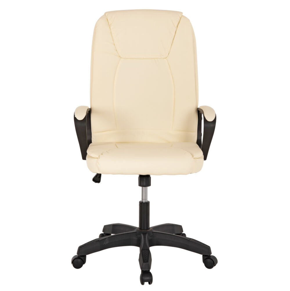 FB91188.03–Kαρέκλα γραφείου σε ΕΚΡΟΥ χρώμα με αναπαυτικά μπράτσα σε ΜΑΥΡΟ χρώμα με ΕΚΡΟΥ μαξιλαράκια με εργονομική κλίση. Η πλάτη είναι ψηλή ενώ έχει πλούσια στρώση από αφρώδη υλικά, υποστηρίζοντας ολόκληρο τον κορμό σας, ενώ είναι επενδυμένη με υψηλής ποιότητας PU δέρμα, όπως επίσης και το αναπαυτικό κάθισμα με την εξτρά αφρώδη επιφάνεια. Η βάση είναι μαύρη σε σχήμα «αστέρι» και είναι κατασκευασμένη από πολυπροπυλένιο.