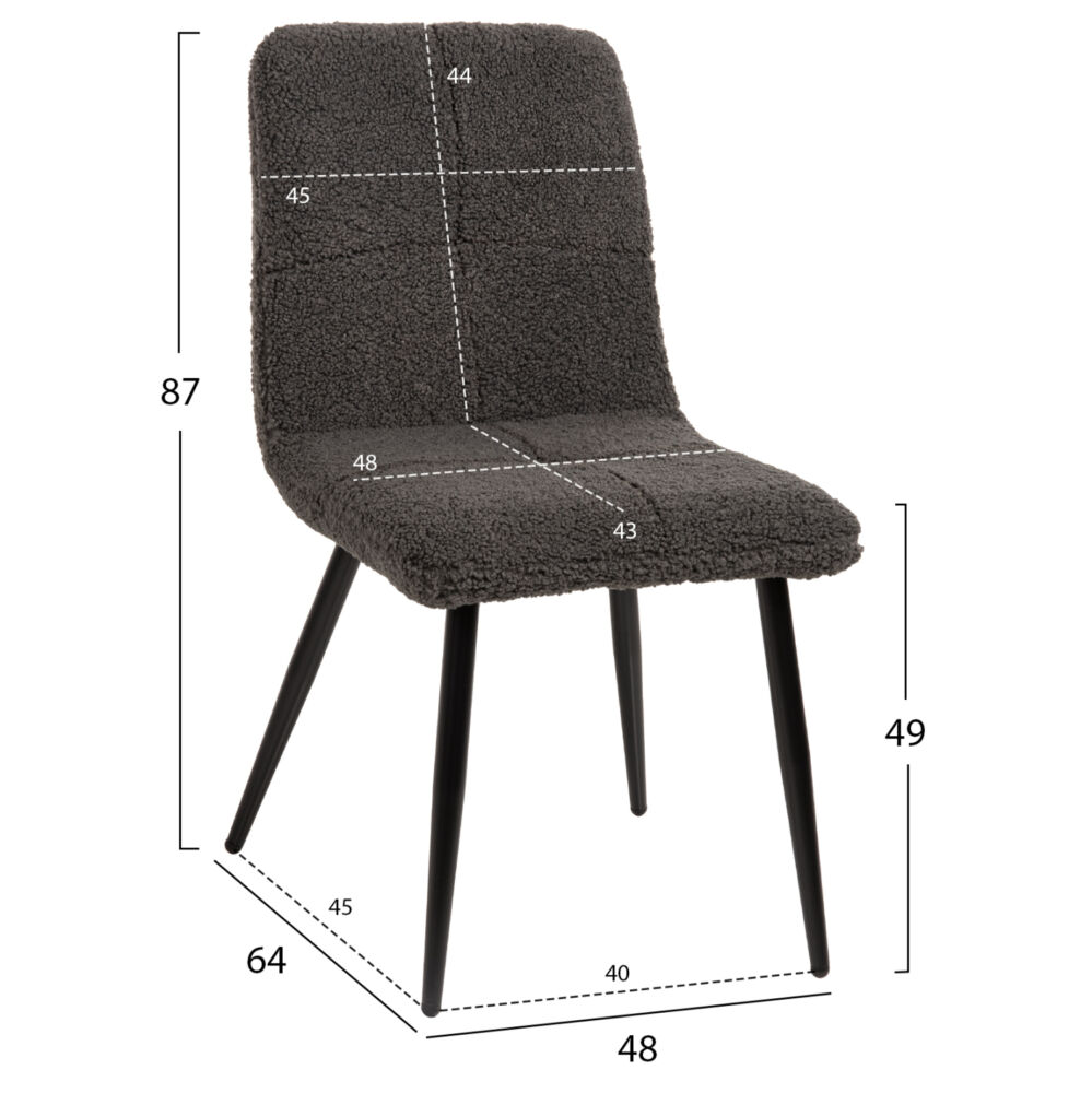 Η καρέκλα FB98590.01 είναι μοντέρνα, άνετη και σταθερή! Το κυρίαρχο χρώμα είναι το ΓΚΡΙ, ενώ τα 4 πόδια είναι σε μαύρο χρώμα. Η επένδυση της καρέκλας έχει γίνει με ξεχωριστό ύφασμα TEDDY που θα δώσει μια διαφορετική όψη στον χώρο σας. Πρόκειται για μια πρόταση λιτή, κυρίως για την τραπεζαρία σας, αλλά και που θα ταιριάξει σχεδόν παντού!