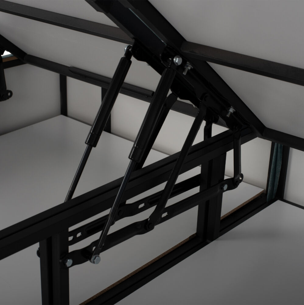 Ο σκελετός του κρεβατιού είναι ξύλινος, πράγμα που καθιστά το κρεβάτι εξαιρετικά στιβαρό και ανθεκτικό, χάρη και στην ενισχυμένη κατασκευή του. Ο μηχανισμός αποθήκευσης είναι μεταλλικός για αντοχή στο βάρος και στον χρόνο.