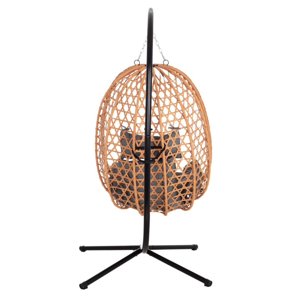 Η κρεμαστή φωλιά FB96468.05 αποτελεί μια ιδιαίτερα κομψή και άνετη πρόταση για εξωτερικούς και εσωτερικούς χώρους. Ο σταθερός μαύρος σκελετός από μέταλλο εξασφαλίζει ασφάλεια και αντοχή, ενώ η φωλιά με καφέ πλέξη από P.E. Rattan προσδίδει μοντέρνα αισθητική και φυσικό χαρακτήρα.