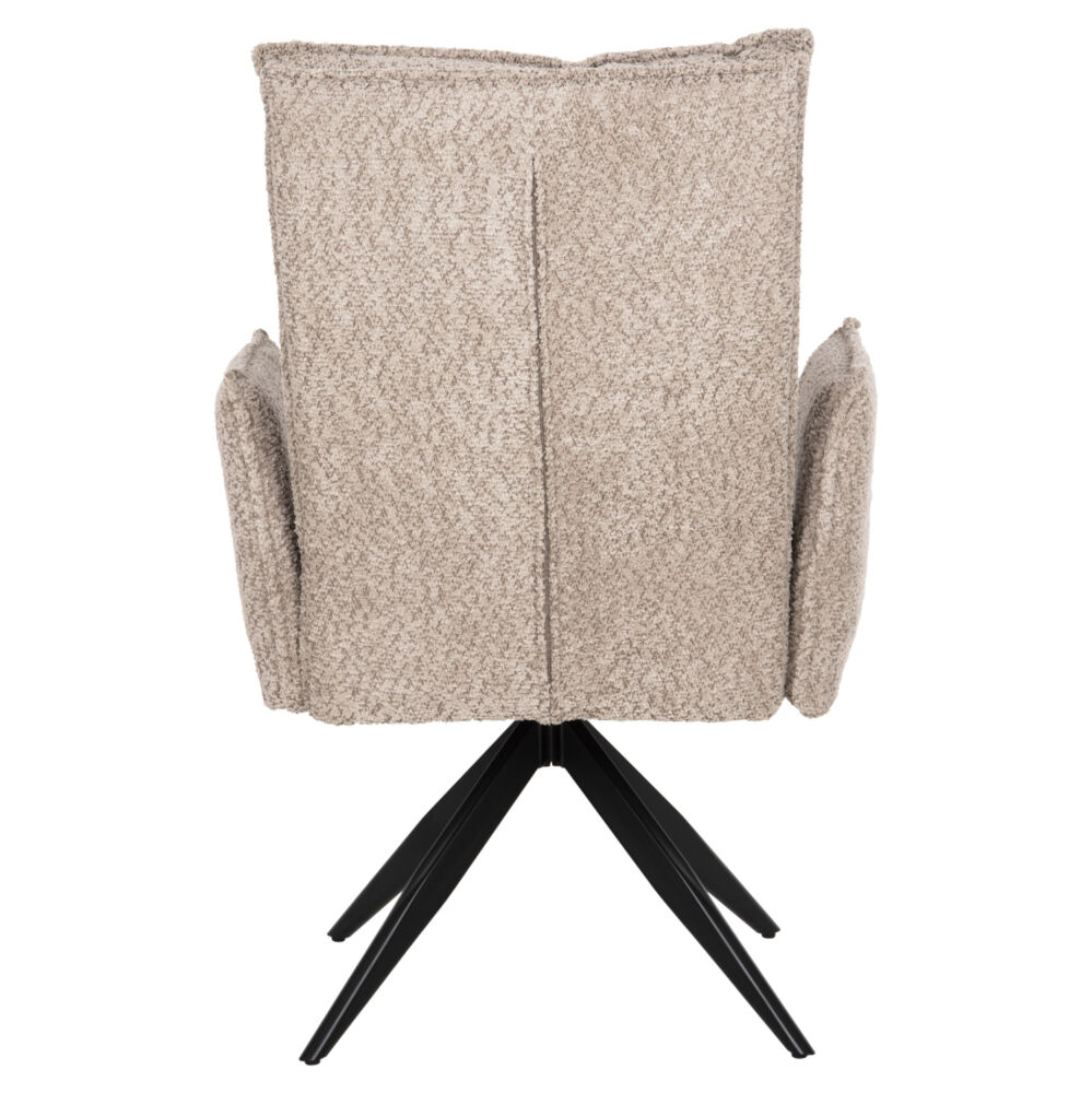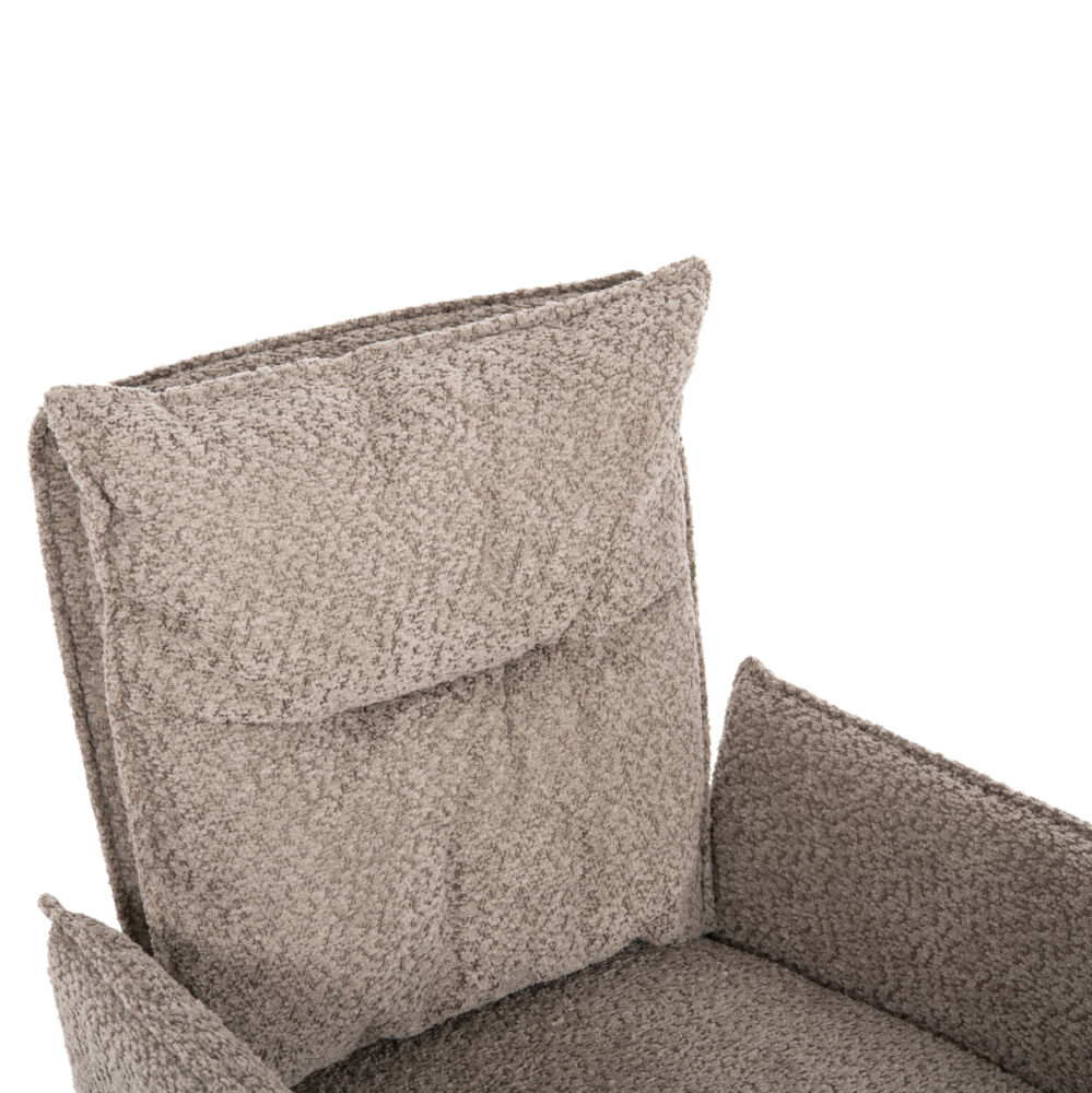 Αυτό είναι το πολυθρονάκι FB99846.07 σε ΣΚΟΥΡΟ ΜΠΕΖ χρώμα με 4 μεταλλικά πόδια σε ΜΑΥΡΟ χρώμα. Η πλάτη είναι ψηλή και δίνει την εντύπωση ότι είναι αφαιρούμενο μαξιλάρι ενώ στην πραγματικότητα αποτελεί μέρος του σκελετού, ενώ το κάθισμα είναι αναπαυτικότατο χάρη και στο γεγονός ότι διαθέτει ελατήρια, κι όχι μόνο αφρολέξ. Τα μπράτσα είναι χαμηλά ενώ το ύφασμα είναι υψηλής ποιότητας και δίνει μια αίσθηση πολυτέλειας. Το χαρακτηριστικό, όμως, που κάνει αυτή την πολυθρόνα να ξεχωρίζει είναι ότι τα πόδια έχουν διάταξη «αστέρι», δίνοντας την εντύπωση ότι η πολυθρόνα είναι περιστρεφόμενη.