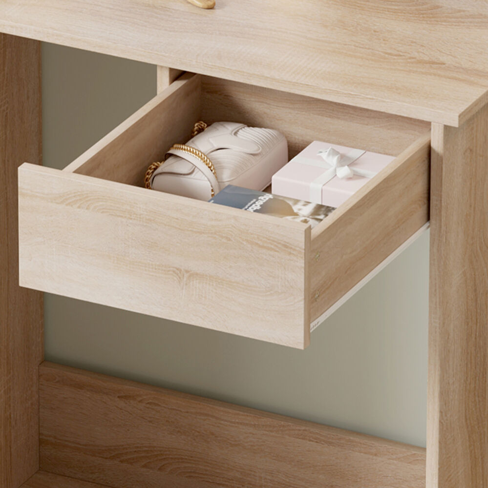 Η νέα τουαλέτα FB92501.01 είναι ένα πρακτικότατο έπιπλο σε χρώμα SONAMA που θα αλλάξει την εικόνα του χώρου σας. Αποτελείται από ένα τραπέζι με καθρέπτη και 1 συρτάρι κάτω από την επιφάνεια. Αυτό όμως που κερδίζει τις εντυπώσεις είναι ότι ο καθρέπτης συνοδεύεται από φώτα LED περιμετρικά, καθώς και από 2 ραφάκια που δημιουργούν 3 χώρους τοποθέτησης αντικειμένων στην δεξιά πλευρά, απογειώνοντας την χρησιμότητα του επίπλου.