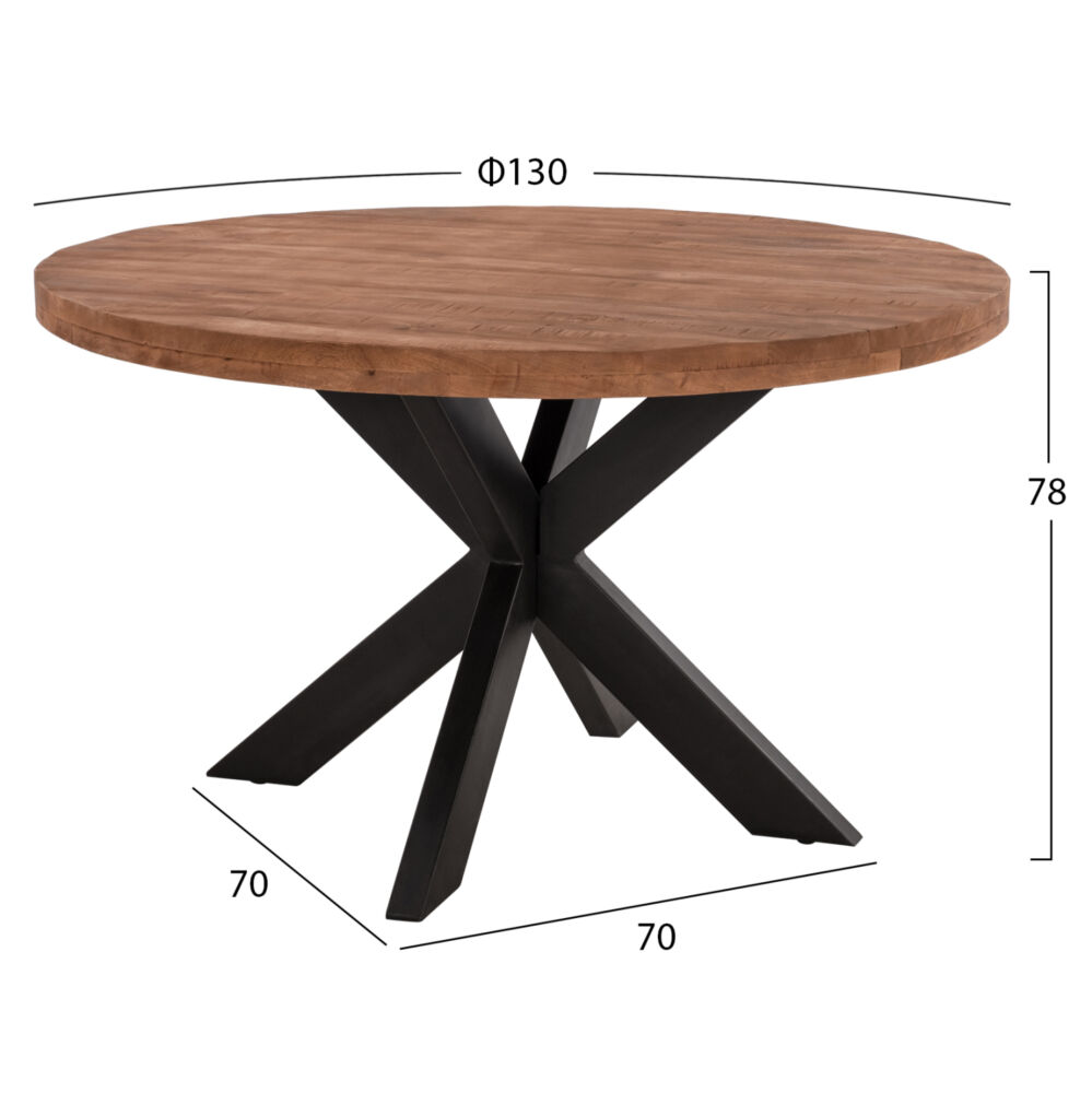 Ανακαλύψτε το μοναδικό χειροποίητο τραπέζι FB98484.11 με επιφάνεια από φυσικό μασίφ ξύλο MANGO. To σχήμα είναι στρογγυλό (ροτόντα) και στηρίζεται σε μαύρα μεταλλικά πόδια σε διάταξη διπλού χιαστί.