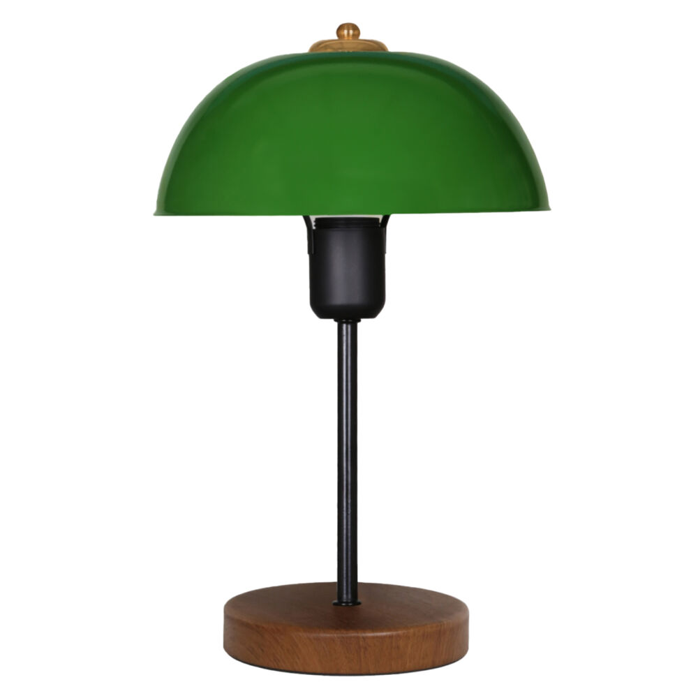 Επιτραπέζιο διακοσμητικό φωτιστικό με ξύλινη κυκλική βάση σε καφέ χρώμα και «καπέλο» σε σχήμα μανιτάρι σε πράσινο χρώμα. Η κολωνίτσα είναι μεταλλική σε μαύρο χρώμα. Το φως διαχέεται στον χώρο κυρίως προς τα κάτω δίνοντας μια άλλη οπτική διάσταση στον χώρο. Αυτού του είδους τα φωτιστικά δεν προορίζονται για φωτιστικά διαβάσματος και αυτό πρέπει πάντα να λαμβάνεται υπόψη κατά την επιλογή τους. Είναι καθαρά διακοσμητικά και το ταίριασμά τους με τον περιβάλλοντα χώρο θα πρέπει να είναι αρμονικό. Αυτό το φωτιστικό είναι λιτό, κομψό και βολικό σε διαστάσεις παρέχοντας αμέτρητες δυνατότητες «δεσίματος» με την υπόλοιπη διακόσμησή σας. Είναι ένα μικρό έργο τέχνης.