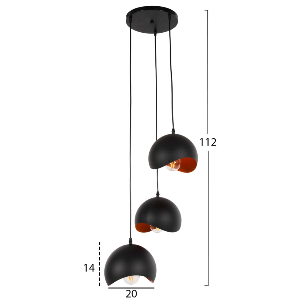 Αφήστε το φως να απλωθεί στον χώρο με ένα μοντέρνο και όμορφο κρεμαστό 3-φωτο οροφής, ολοκληρώνοντας την διακόσμησή σας. Τα συμπαγή σφαιρικά ΜΑΥΡΑ μεταλλικά καπέλα με ΠΟΡΤΟΚΑΛΙ εσωτερικό σε μοντέρνο design με καμπύλες σε διαφορετικά ύψη, θα δώσουν μια νέα εικόνα στον χώρο σας.