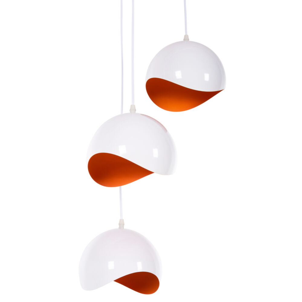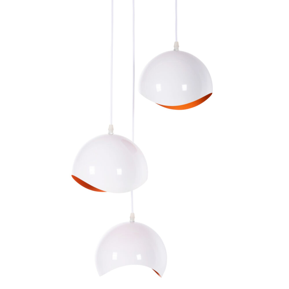 Αφήστε το φως να απλωθεί στον χώρο με ένα μοντέρνο και όμορφο κρεμαστό 3-φωτο οροφής, ολοκληρώνοντας την διακόσμησή σας. Τα συμπαγή σφαιρικά ΛΕΥΚΑ μεταλλικά καπέλα με ΠΟΡΤΟΚΑΛΙ εσωτερικό σε μοντέρνο design με καμπύλες σε διαφορετικά ύψη, θα δώσουν μια νέα εικόνα στον χώρο σας.