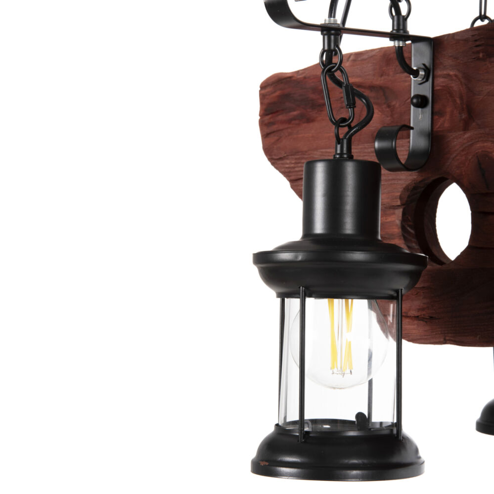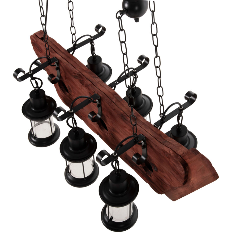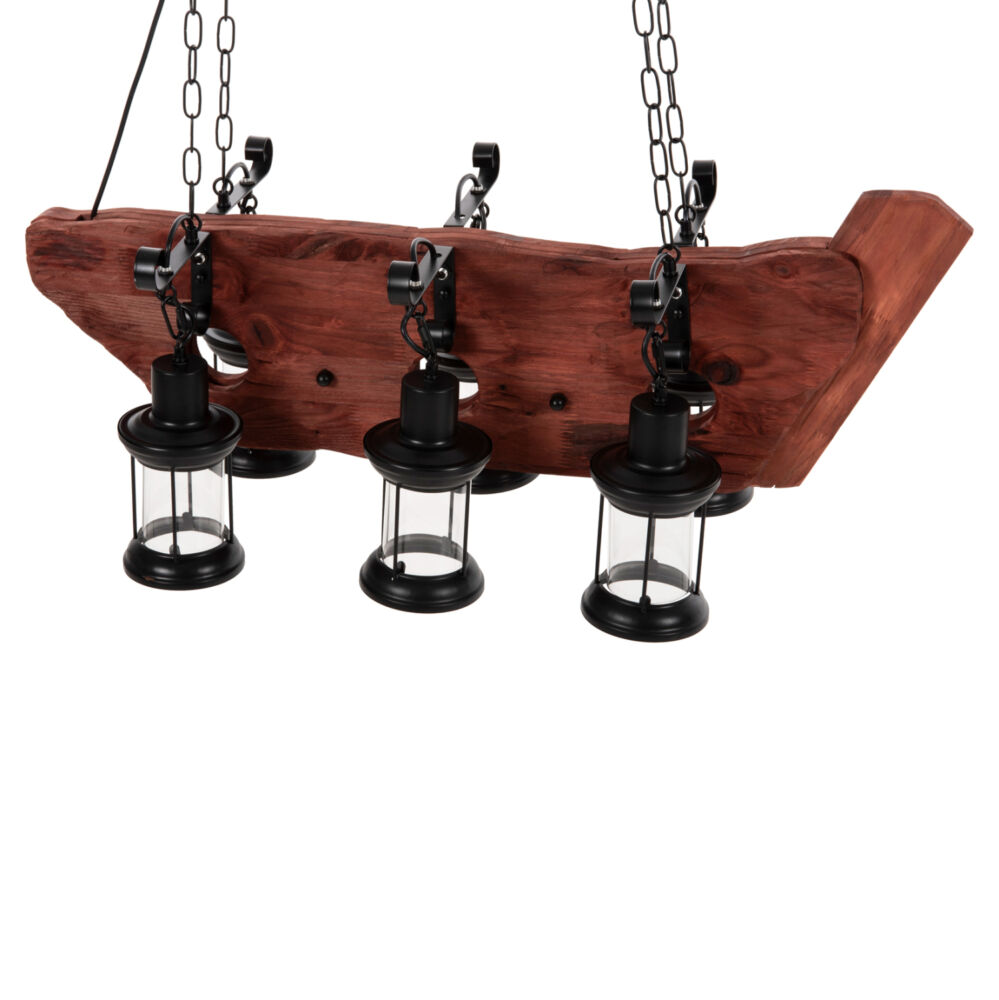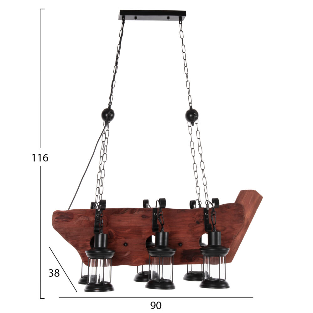 Ανακαλύψτε το εντυπωσιακό 6-φωτο φωτιστικό οροφής FB94117. Ένα φωτιστικό που θα αποτελέσει το κέντρο του ενδιαφέροντος χάρη στο εντυπωσιακό και εμπνευσμένο του design. Τα 6 φαναράκια που περιέχουν τους λαμπτήρες κρέμονται με όμορφες μεταλλικές κρεμάστρες από μια ξύλινη πλάκα με την μορφή πλοίου, η οποία με την σειρά της κρέμεται από την οροφή με αλυσίδες.