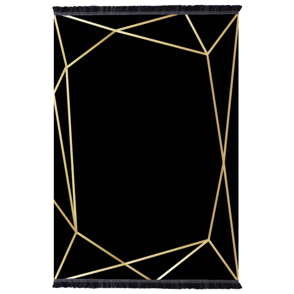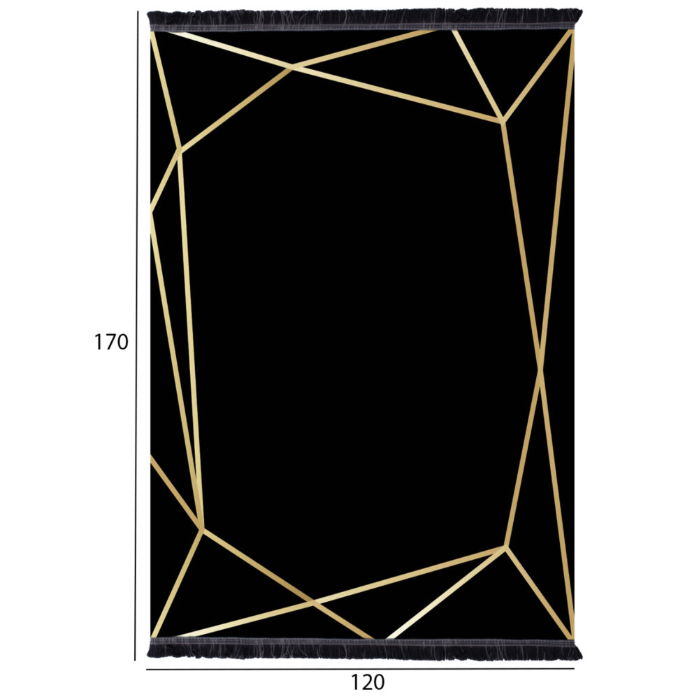 Το μοντέρνο αυτό χαλί, με μονόχρωμο φόντο σε μαύρο χρώμα και τριγωνικά σχέδια στην μπορντούρα σε χρυσό χρώμα θα αποτελέσει αντικείμενο συζητήσεων στο σαλόνι σας. Άλλωστε, η γοητεία πού ασκεί το χαλί είναι τόσο δυνατή, πού κανένα δεν αφήνει αδιάφορο.
