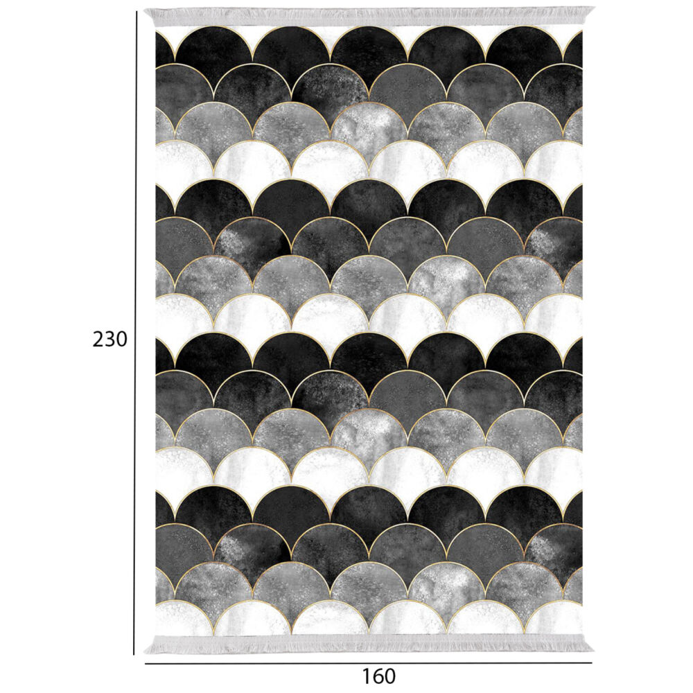 FB97675.33- χαλί σαλονιού—— Σας παρουσιάζουμε την νέα προσθήκη στην γκάμα των προϊόντων μας. Αυτό το χαλί απεικονίζει με μια αφηρημένη ματιά, ημικυκλικά κύματα σε χρώμα ΑΣΠΡΟ, ΜΑΥΡΟ, ΓΚΡΙ. Η αίσθηση της συμμετρίας των κυμάτων που δίνει αυτό το χαλί αιχμαλωτίζει το βλέμμα και ερεθίζει τη φαντασία του καθενός.